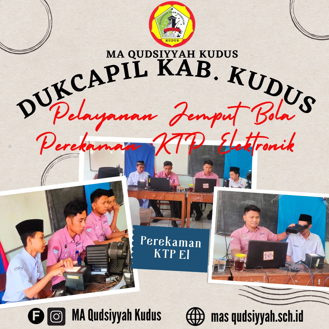 Senin, 15 Maret 2023. Madrasah Aliyah (MA) Qudsiyyah Kudus kedatangan tamu dari Dinas Kependudukan dan Pencatatan Sipil (DUKCAPIL) Kudus. Di tengah-tangah proses pembelajaran santri-santri MA Qudsiyyah, para petugas dari DUKCAPIL melakukan perekaman data untuk KTP elektronik terhadap Santri MA Qudsiyyah Kudus yang berusia minimal 16 tahun.